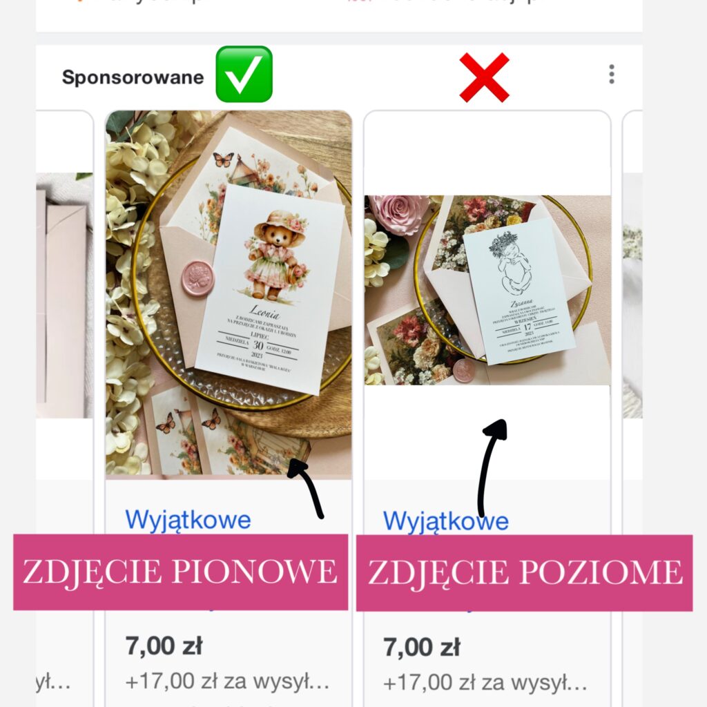 Po drugie – chcąc reklamować się w kampaniach Google Ads, poziome zdjęcia – nie będą wybijać się na tle konkurencji. O wiele lepiej prezentują się zdjęcia pionowe w proporcji 3×4, czyli np. 3000×4000 px. Są bardziej widoczne, większe, i z mojego doświadczenia właśnie takie wygrywają na aukcjach z innymi reklamującymi się.