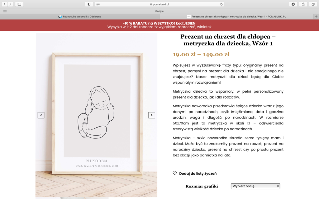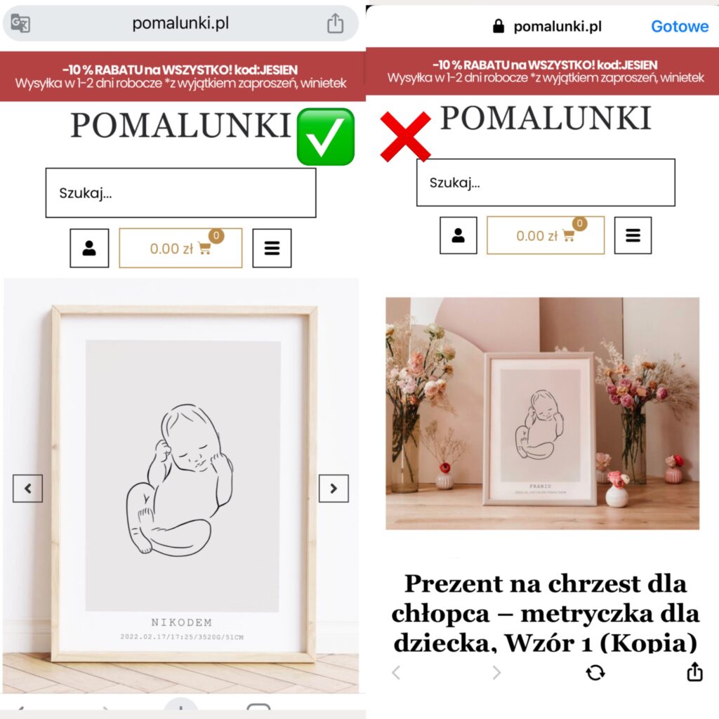 Ma to istotne znaczenie przy wdrożeniu galerii zdjęć. Bardzo źle się ogląda i przewija galerię, w której znajdują się raz zdjęcia poziome, raz pionowe o różnych wielkościach. Przewijak w lewo lub prawo znajduje się po środku i po zmianie wielkości zdjęcia, przesuwa się. Ja popełniłam ten błąd na początku i bardzo dużo czasu zajęło nam doprowadzenie galerii zdjęć do ładu (musieliśmy wymieniać WSZYSTKIE zdjęcia, by po 1. galeria bardzo dobrze wyglądała, po 2. zdjęcia produktowe były spójne na stronie kategorii (można oczywiście ustawić w motywie sklepu takie same wielkości zdjęć na stronach kategorii, ale zwykle są one ucinane w złym miejscu lub zjadana jest jakość). Dlatego zadbajmy o to od razu.