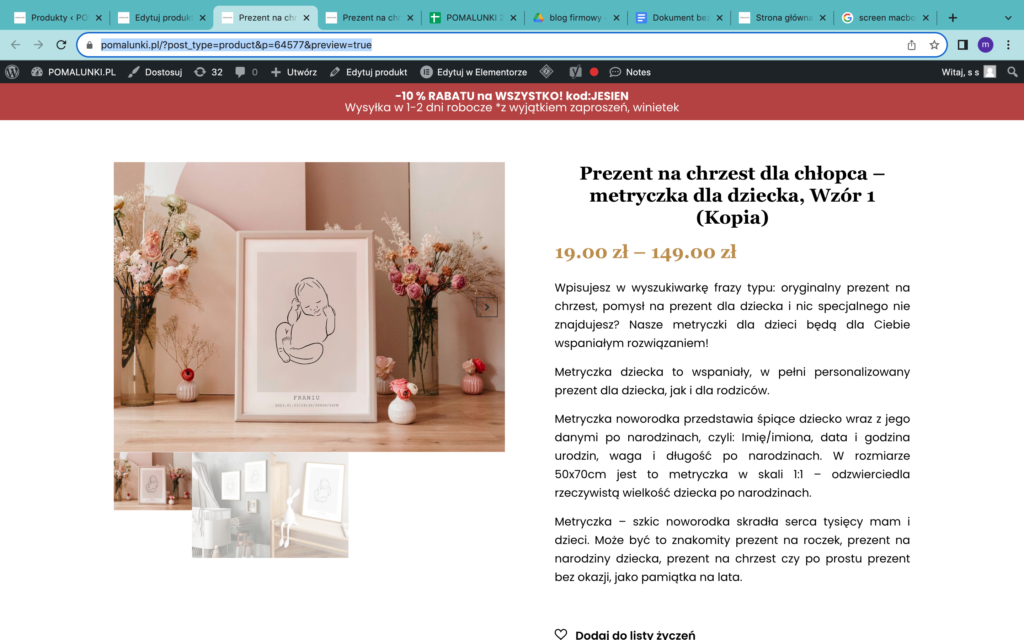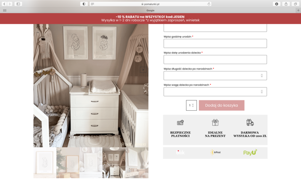 Jeśli już o galerii produktów mowa – warto dodać kilka zdjęcia produktów. W zależności od możliwości. 🙂 W przypadku mojego sklepu, np. plakaty pokazujemy w różnych aranżacjach, co może wpływać na decyzję o zakupie ( jeśli np. kupujesz plakat do swojego wnętrza, taka aranżacja ukazuje, jak może prezentować się w danym stylu). Jedyny problem, jaki mamy ze zdjęciami w aranżacjach, to orientacja zdjęć. Większość aranżacji jest w orientacji poziomej (a jak wyżej wspomniałam nie można mieszać wielkości i orientacji w galerii), dlatego wybieramy zwykle zdjęcia w pionie lub przycinamy kadry.